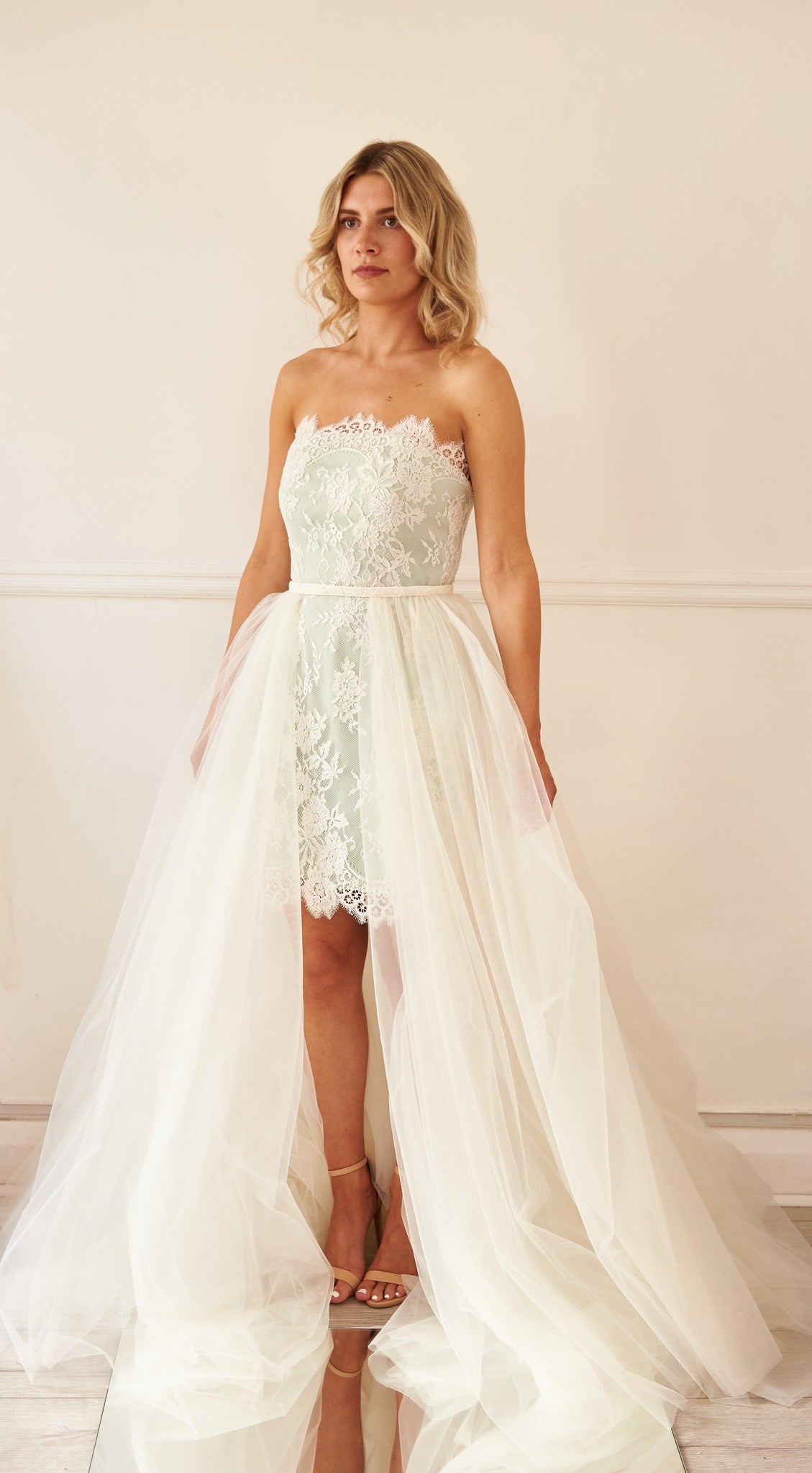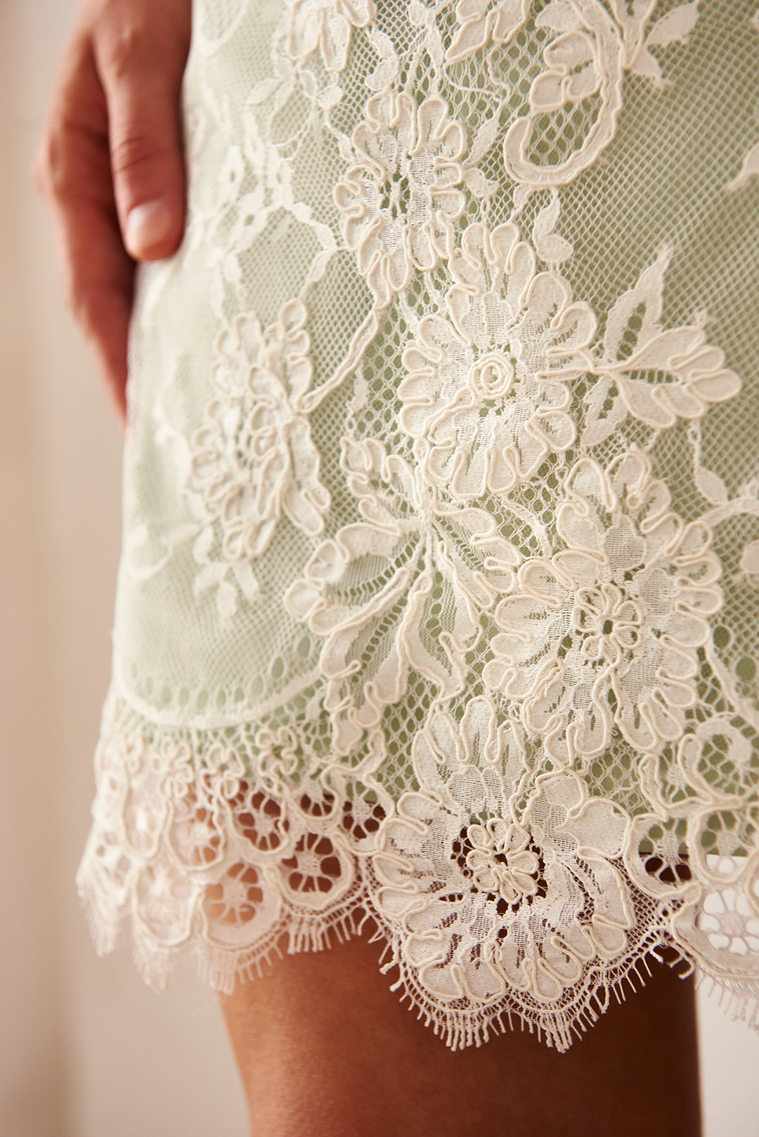 Cindy is a short lace dress, with inner corset structure and corset back, for flexible sizing. Also available in a pencil skirt. Detachable Grace white tulle skirt is sold separately. Dress pattern is made with zero-waste, so no lace is wasted in this design, and the mint lining is saved from ending up in landfills.