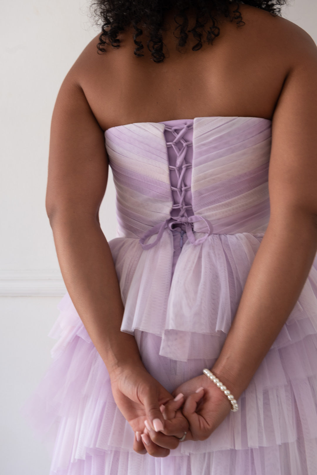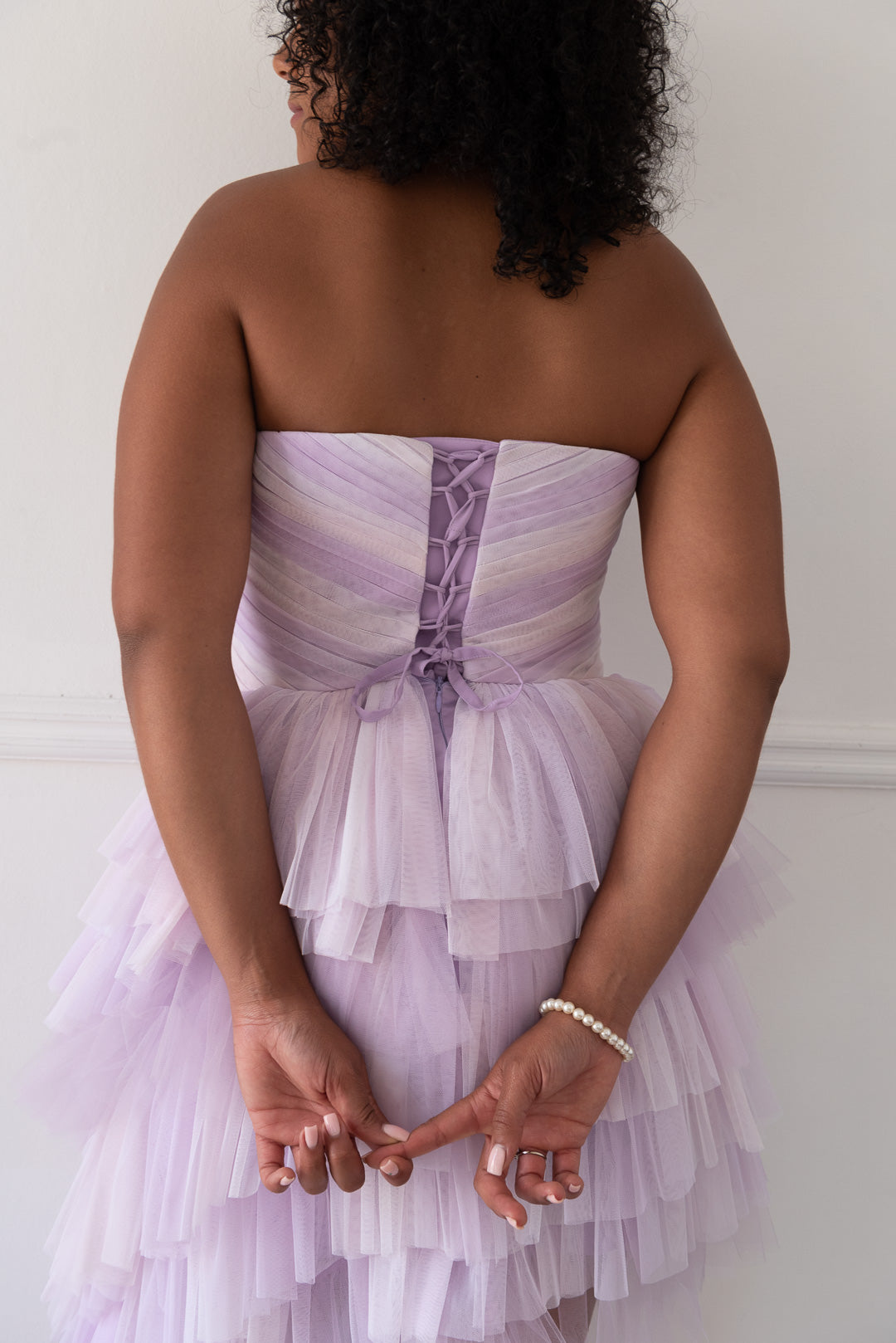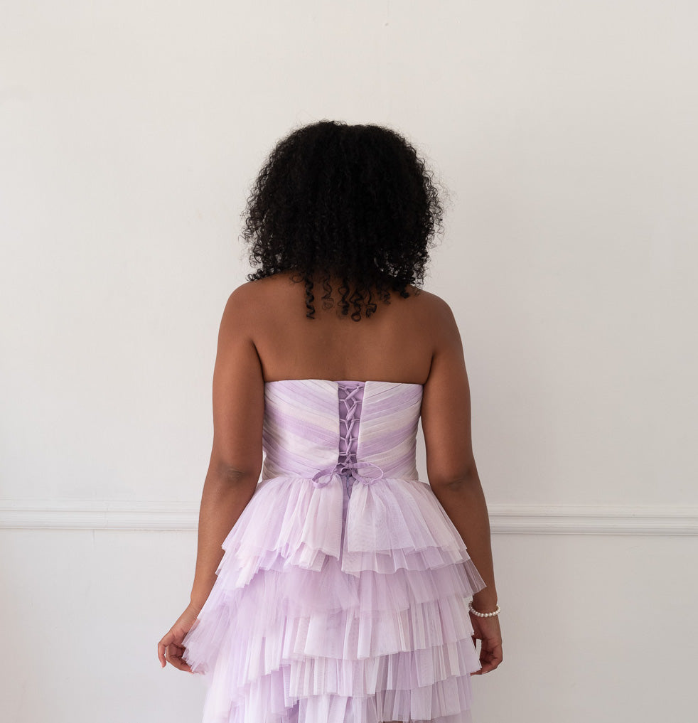 Emily has an asymmetrical hemline which flatters and elongates the figure. With a corseted bodice, fastened at the back with corset lacing, the size is flexible. In two-tones tulle, this dreamy dress is a beautiful mixture of hand draping on the torso and pleating on the skirt.