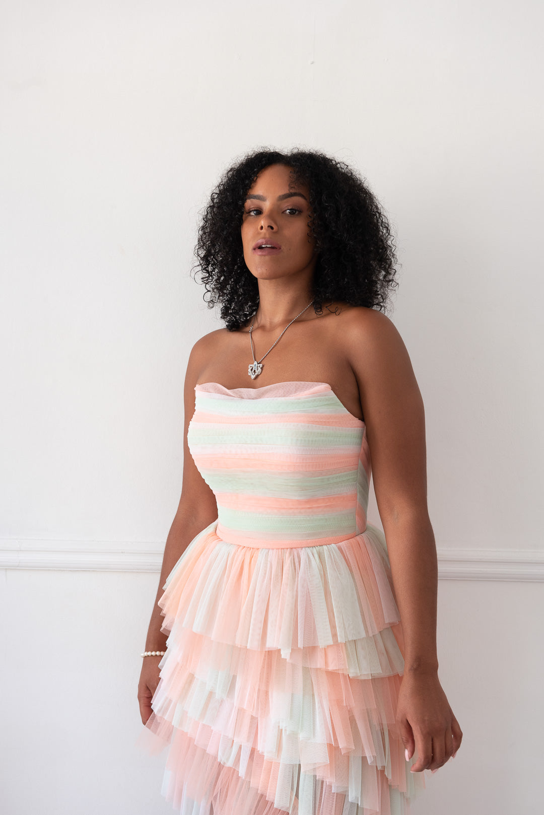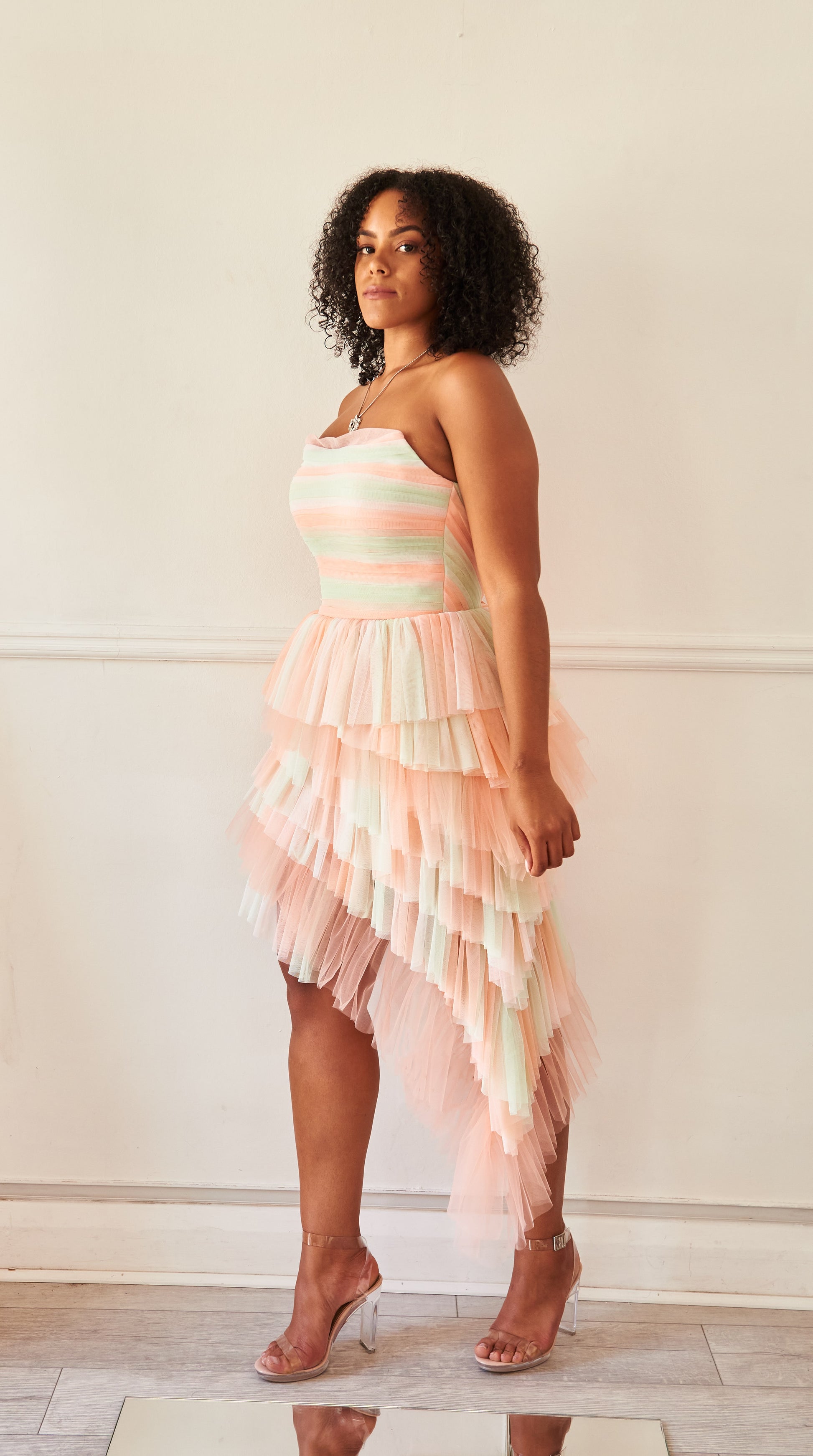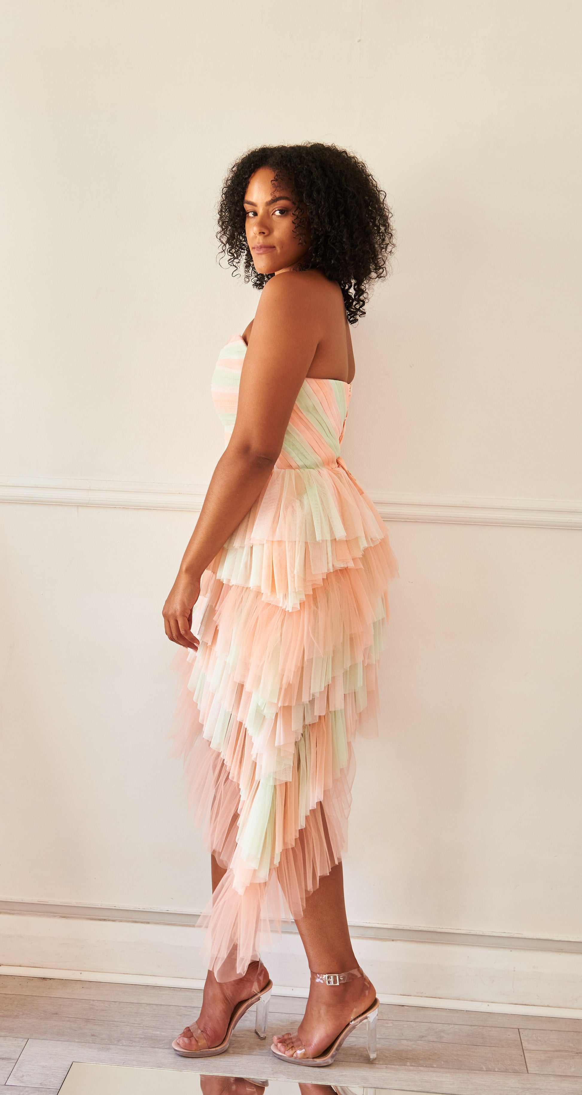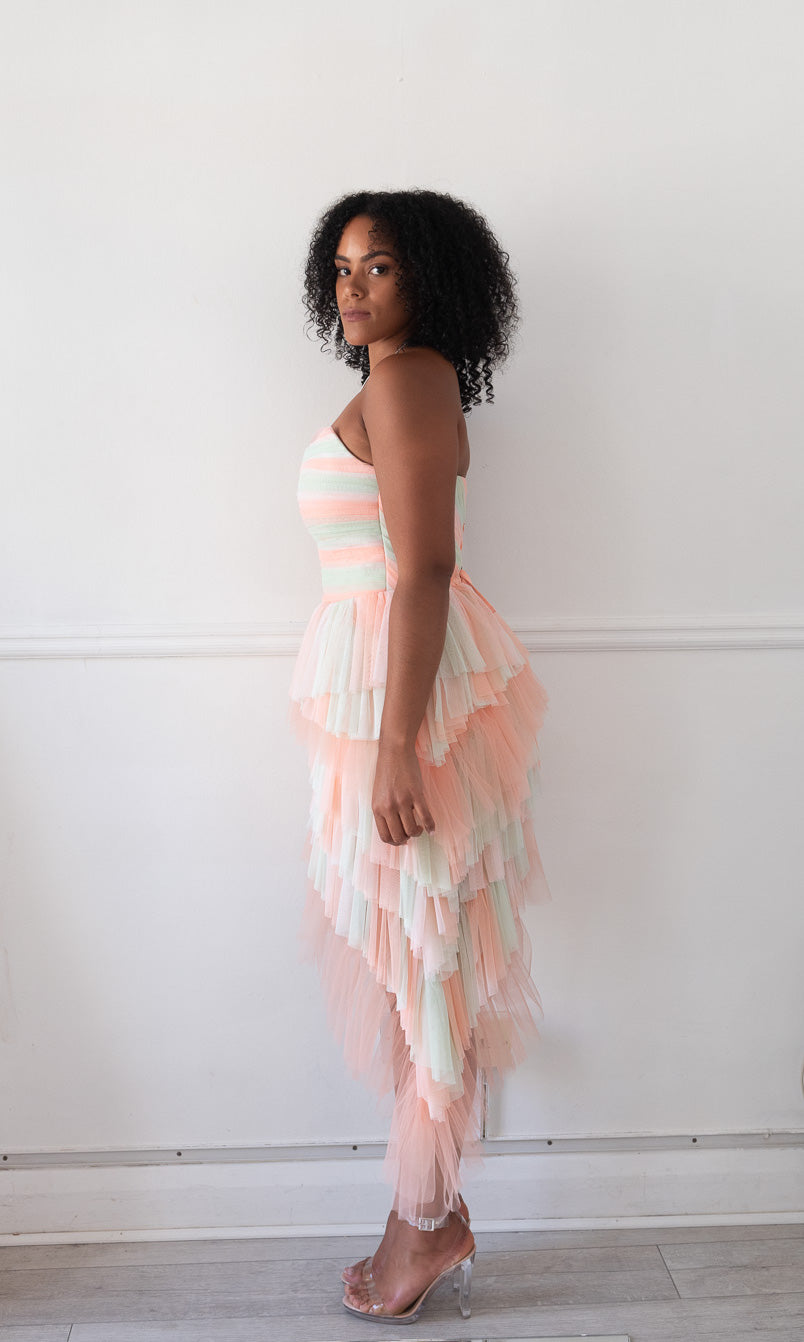 Corset back can be taken in and out by up to 3 inches (2 sizes)- please see below for details on sizes for this particular piece. In spring and summer graduated tulle colours, this piece is light and breezy.