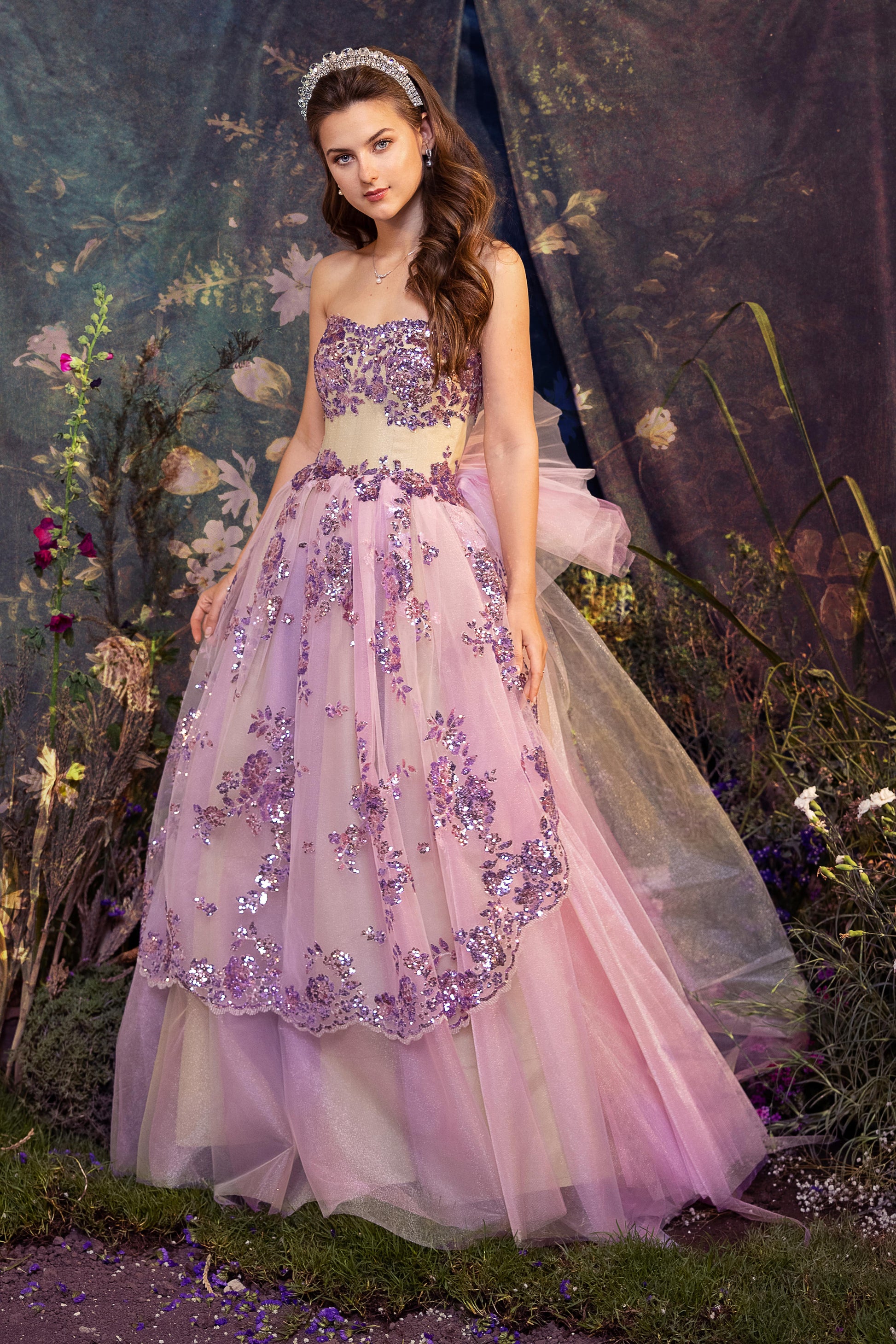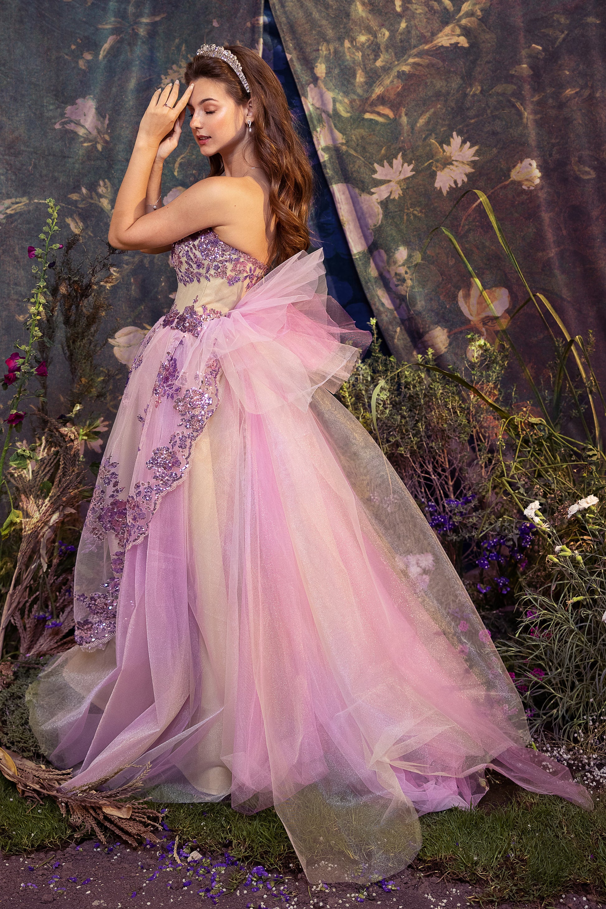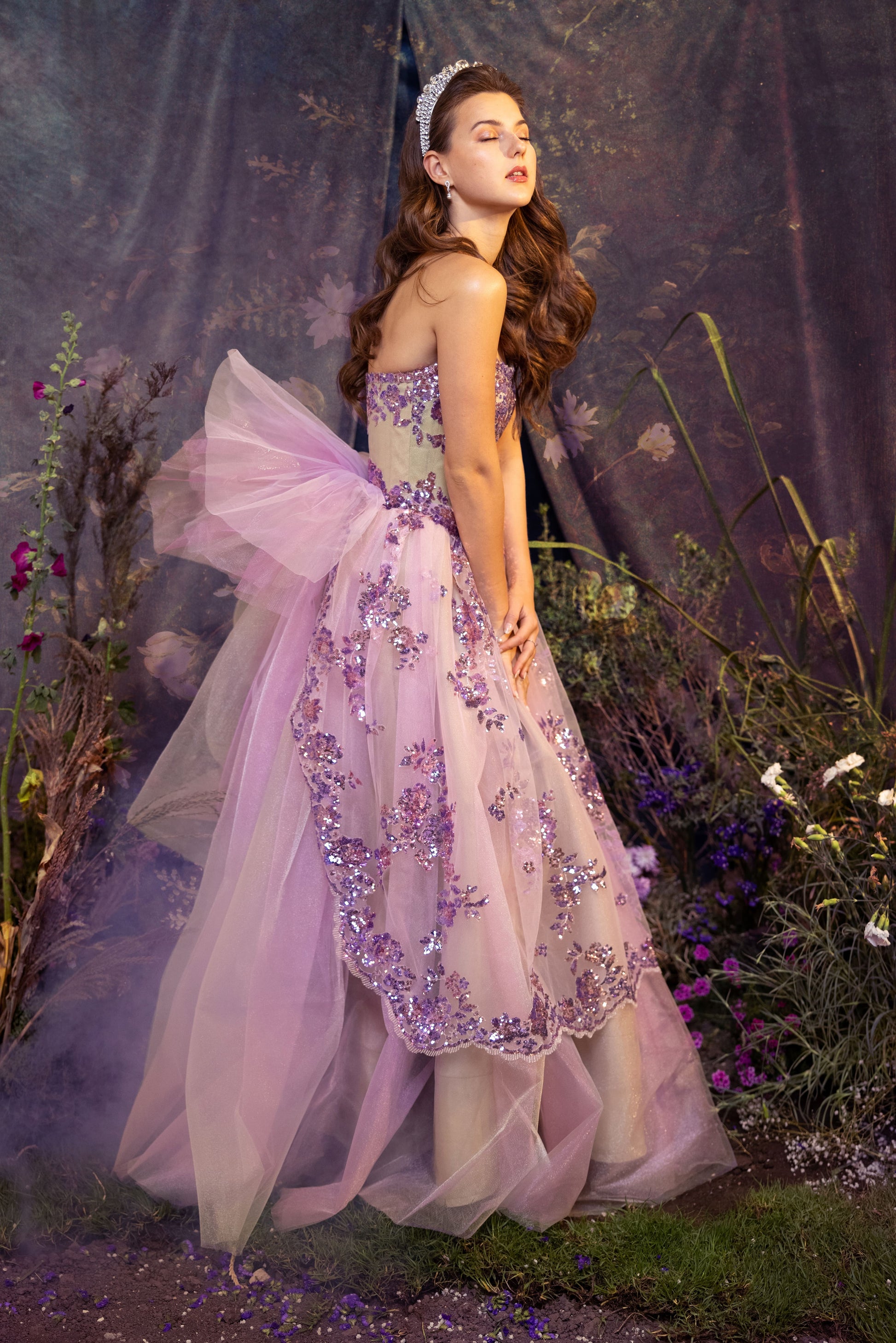 Jeanne blends dreamy hues of tulle together to create the perfect ballgown. With a built-in corset structure and a removable tulle attachment at the back that adds volume and gives a bustle shape, this haute couture dress is a fusion of classic silhouette and modern fabrics, as the lace is sequenced.