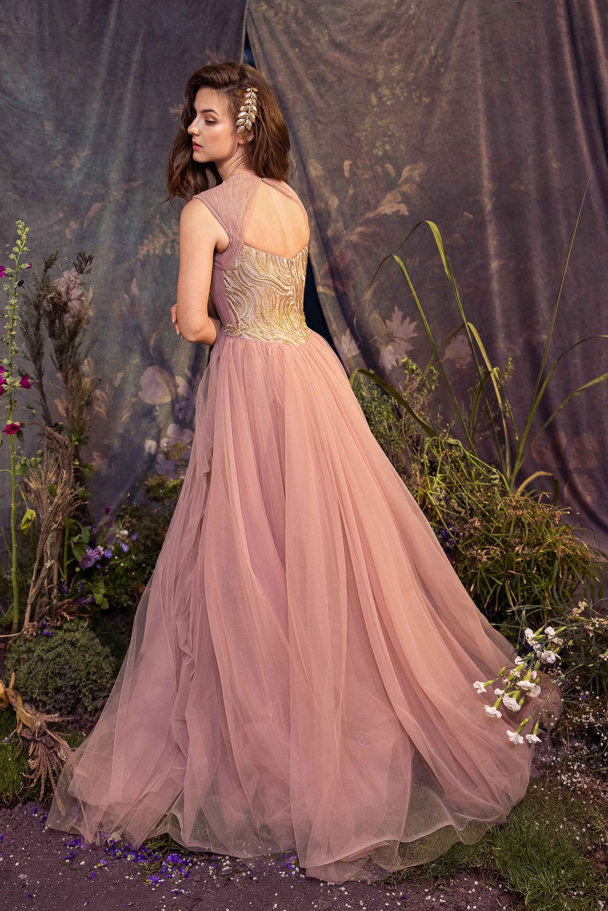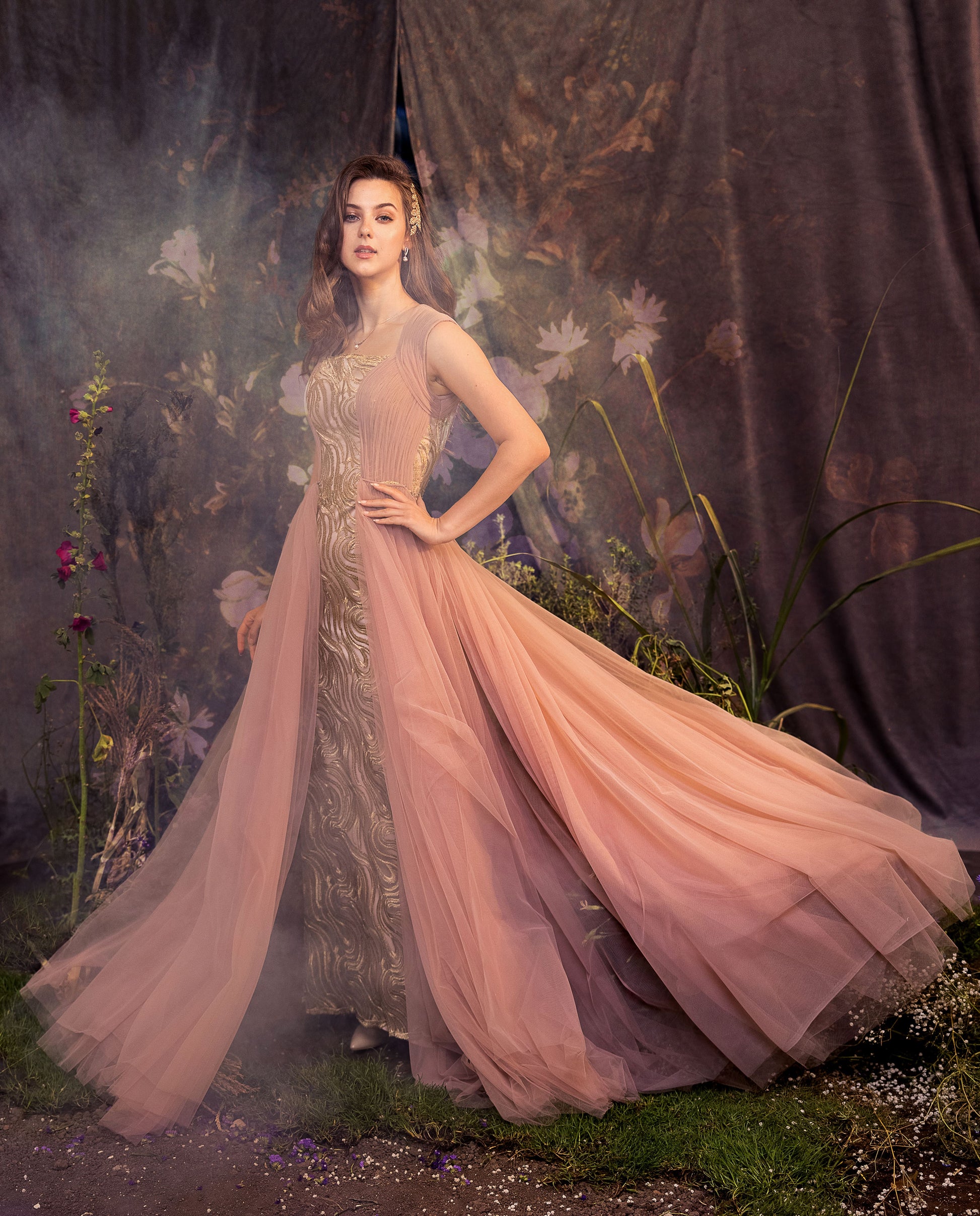 Mary is a harmonious blend of delicate tulle, brocade and mesh, with hand pleating on the bodice. With an inner corset structure and a modular back fastening, as well as a detachable tulle skirt, the dress can be worn in a variety of ways and it’s look transforms drastically.